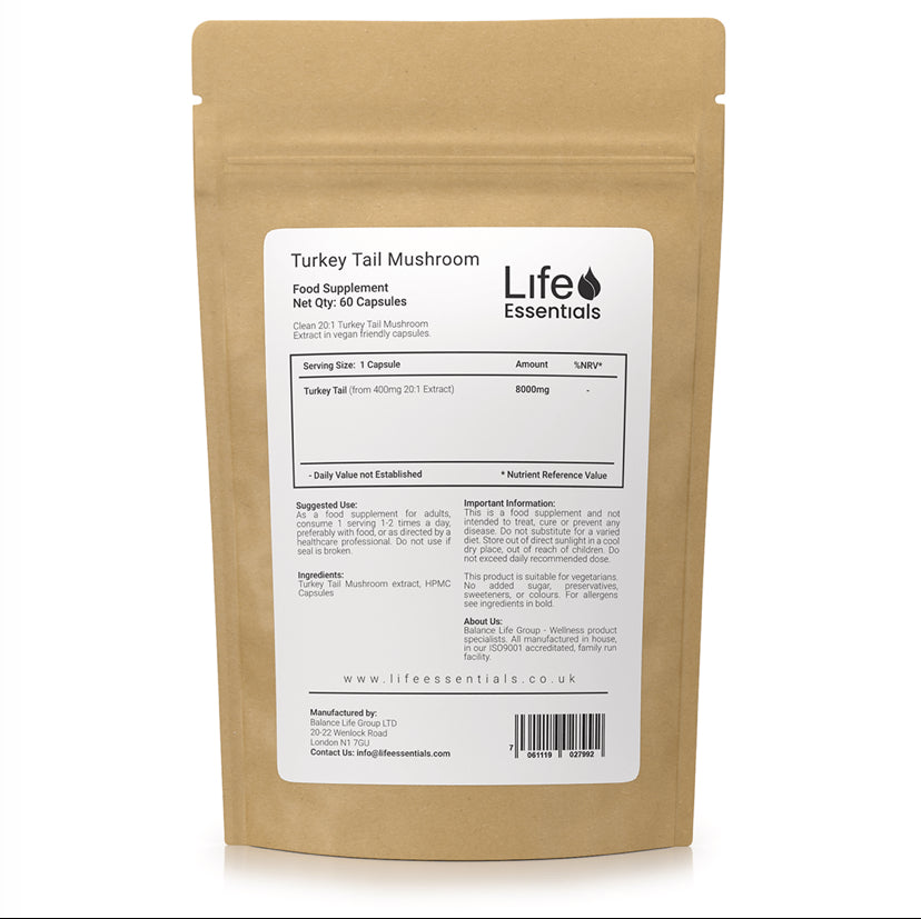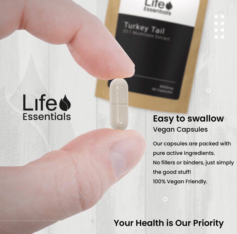 Turkey Tail Mushroom Capsules provide an excellent means to enhance your diet with a top-notch medicinal mushroom. These exceptional capsules contain a Turkey Tail 20:1 Extract, setting them apart from other mushroom capsules that can only accommodate a limited amount of active ingredient. With our 20:1 extract, each capsule contains more than 20 times the active ingredient. So, as they are 400mg, they actually pack a whopping 8000mg of goodness in each capsule!